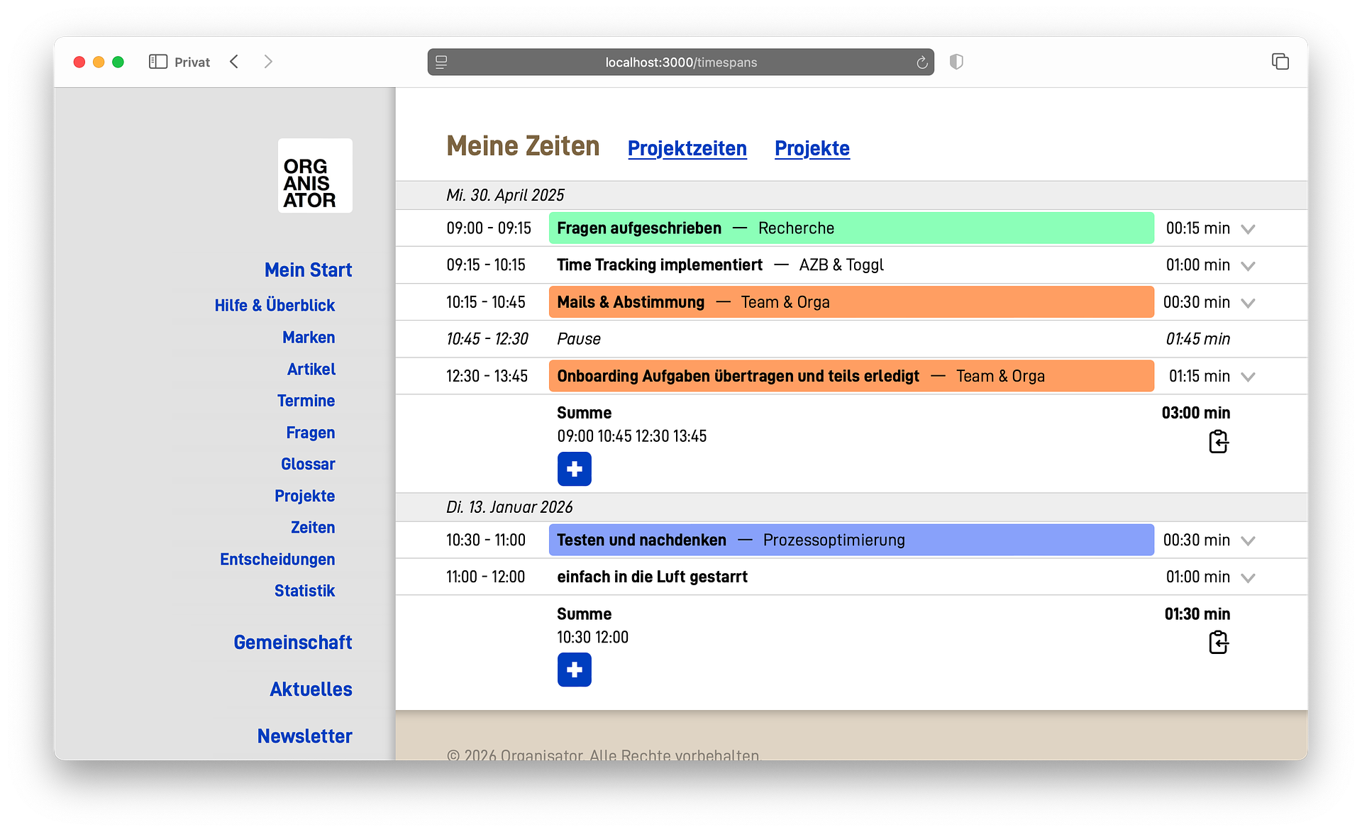 Die OpenSource Community Plattform „organisator“ bietet Projekt-spezifische Zeiterfassung für Einzelne oder Gruppen an. Wie geht das genau, wer kann es nutzen und was bringt es am Ende?